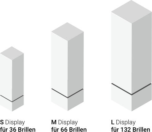 Sie haben die Auswahl: Displays in den unterschiedlichsten Ausführungen sorgen für einen wirkungsvollen und dabei einfach zu handelnden Auftritt. Stand-, Theken- und Doppelsäulen-Displays mit einem Fassungsvermögen von 24 bis 202 Brillen. Passend zur Innengestaltung Ihres Stores wählen Sie für Fuß